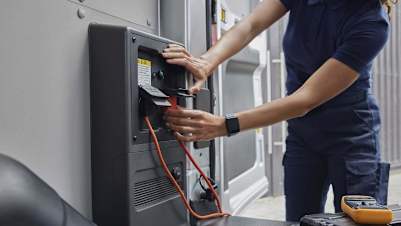 Delivering 2.3 kW of power via onboard sockets, so you can plug in and get to work. Featured on the all-electric E-Transit.